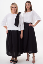 Юбка, зауженная к низу, на обтачке. Перёд с талевыми вытачками и центральным швом, который заканчивается разрезом. По заднему полотнищу талевые вытачки, центральный шов и застёжкой на потайную тесьму-молнию. От выточек до бокового шва вставлены резинки. Юбка на тонкой трикотажной подкладке. Украшает костюм отделочные строчки. Дополняет костюм пояс с пряжкой.