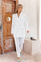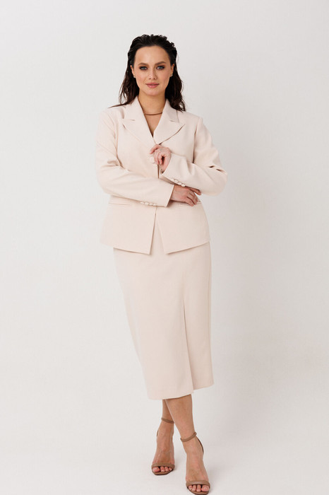 Элегантный женский костюм классического кроя. Комплект состоит из жакета и юбки-карандаш. Жакет полуприлегающего силуэта, спинка со средним швом, заканчивающимся шлицей. По конструкции предусмотрен воротник с лацканами. Застежка на две пуговицы. В передней части предусмотрены два прорезных кармана. Рукава втачные, двухшовные, со шлицей на пуговицах. Юбка длиной миди, слегка зауженная к низу. Застежка на молнию в центральном шве. В левой боковой части юбки размещен разрез от колена до низа, что обеспечивает свободу движения и добавляет элегантности. Жакет и юбка на подкладке. Жакет дополняет декоративная съемная брошь.