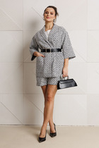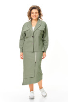 Элегантный женский костюм классического кроя. Комплект состоит из жакета и юбки-карандаш. Жакет полуприлегающего силуэта, спинка со средним швом, заканчивающимся шлицей. По конструкции предусмотрен воротник с лацканами. Застежка на две пуговицы. В передней части предусмотрены два прорезных кармана. Рукава втачные, двухшовные, со шлицей на пуговицах. Юбка длиной миди, слегка зауженная к низу. Застежка на молнию в центральном шве. В левой боковой части юбки размещен разрез от колена до низа, что обеспечивает свободу движения и добавляет элегантности. Жакет и юбка на подкладке. Жакет дополняет декоративная съемная брошь.