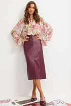 Брюки с высокой посадкой слегка зауженные к низу, на притачном поясе. По переду застёжка молния с гульфиком и откоском, косые подрезы и втачные карманы. Пояс застёгивается на прорезную петлю и пуговицу. Спинка с талевыми вытачками и накладными карманами на задних половинках брюк. Украшают брюки хольнитены и отделочные двойные строчки.