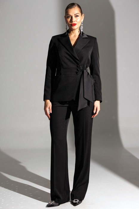 Жакет полуприлегающего силуэта с двухбортной застежкой на три обтяжные из атласной ткани пуговицы и одной потайной. Край борта овальной формы, что придаёт жакету утонченность. По переду обработаны фигурные рельефы из проймы, также имеется горизонтальный подрез,в котором расположены карманы. На правой центральной части полочки - три складки, параллельные подрезу. Дополнительно с левой стороны завязывается атласный бант,что придает нарядность и особый шарм. Одна часть банта крепиться на пуговицу, другая в боковом шве. Спинка со средним швом и вертикальными рельефами из проймы. Воротник пиджачного типа из атласной ткани с пикообразными лацканами. Рукава двухшовные, со шлицей в локтевом шве на одну пуговицу, также обтяжную из атласа. Жакет на подкладке. Брюки классические,со стрелками,с притачным поясом-сзади частично на резинке для удобства и комфортной посадки. На поясе имеются пять шлёвок. На передних половинках присутствуют карманы. Застёжка на молнию и пуговицу. Костюм выполнен из качественной костюмной ткани с отделкой из атласа.