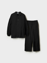 Жакет полуприлегающего силуэта с двухбортной застежкой на три обтяжные из атласной ткани пуговицы и одной потайной. Край борта овальной формы, что придаёт жакету утонченность. По переду обработаны фигурные рельефы из проймы, также имеется горизонтальный подрез,в котором расположены карманы. На правой центральной части полочки - три складки, параллельные подрезу. Дополнительно с левой стороны завязывается атласный бант,что придает нарядность и особый шарм. Одна часть банта крепиться на пуговицу, другая в боковом шве. Спинка со средним швом и вертикальными рельефами из проймы. Воротник пиджачного типа из атласной ткани с пикообразными лацканами. Рукава двухшовные, со шлицей в локтевом шве на одну пуговицу, также обтяжную из атласа. Жакет на подкладке. Брюки классические,со стрелками,с притачным поясом-сзади частично на резинке для удобства и комфортной посадки. На поясе имеются пять шлёвок. На передних половинках присутствуют карманы. Застёжка на молнию и пуговицу. Костюм выполнен из качественной костюмной ткани с отделкой из атласа.
