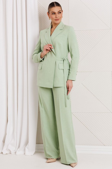 Женский трендовый костюм, состоящий из жакета и брюк. Жакет полуприлегающего силуэта, удлиненный, со смещенной бортовой застежкой на завязку и потайную пуговицу. По переду талиевые вытачки, выходящие от горизонтальных подрезов, в которых обработаны карманы в рамку с клапанами. На груди обработана листочка, имитирующая нагрудной карман. Спинка со средним швом и талиевыми вытачками. Рукав втачной, двухшовный, со шлицей. На шлицах по две декоративных пуговиц. Воротник пиджачного типа. Жакет на подкладке. Брюки на притачном поясе с резинкой, прямые, со складкой по талии и с заутюженными кантами. По бокам обработаны карманы. Брюки с завышенной талией, свободной формы, выгодно подчеркивают изящность ног и придают fashion-нотку образу. Удобная в носке ткань, хорошая посадка по фигуре, универсальность и лаконичность модели не оставят равнодушной ни одну женщину