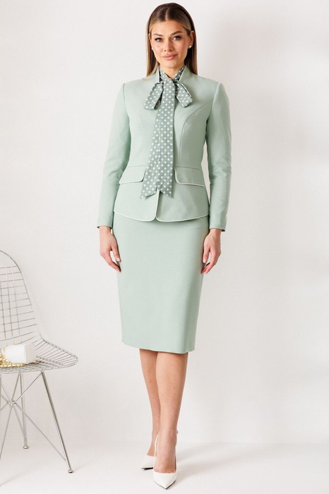 Трехпредметный костюм с приталенным жакетом в модной цветовой гамме – яркий экземпляр для вашей коллекции. Жакет с рельефами. По переду и спинке на полочках обработаны карманы с клапаном. Рукав втачной двухшовный. Воротник стойка. Застежка на петли пуговицы. Жакет декорирован кантом по линии борта и клапаном.