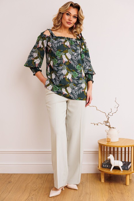 Комплект женский, состоящий из блузы и брюк. Блуза удлиненная, в боковых швах с разрезами. По верхнему краю блузы кулиска с резинкой. Рукав расширенный, на широкой манжете. Для удобства в носке мы дополнили блузу