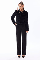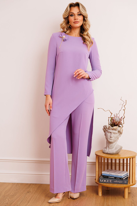 Туника полуприлегающего силуэта . Спинка со средним швом и талиевыми вытачками. По переду выполнены нагрудные вытачки, которые выходят из боковых швов. Низ туники ассиметричной формы. Вырез горловины округлой формы. Брюки прямые, слегка зауженные к колену. На притачном поясе сзади с резинкой. Брюки с карманами. Застежка на тесьму молнию. Костюм декорирован съемной брошью.