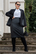 Комплект женский, состоящий из жакета и юбки. Жакет полуприлегающего силуэта с рельефами по переду и спинке. Спинка со средним швом. Рукав втачной, двухшовный. Воротник-стойка, переходящий в шарф. Юбка прямая, зауженная к низу, сверху на притачном поясе с резинкой. Застежка на тесьму-молнию в среднем шве, который переходит в шлицу. Костюм на подкладке. Главным декором и акцентом является съемная брошь.