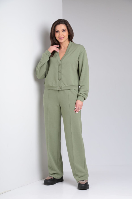 Комплект женский двух предметный состоящий из укороченного кардигана и брюк (не утепленный). Отличный вариант для спортивного и повседневного образа. Кардиган свободного кроя на застежку петли пуговицы и спущенной линией плеча. Рукав прямой, одно шовный с притачной манжетой по низу. По низу кардигана притачной пояс. Брюки прямые с высокой посадкой, боковыми карманами и притачным поясом. Пояс брюк со сборкой на эластичную ленту.