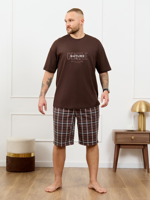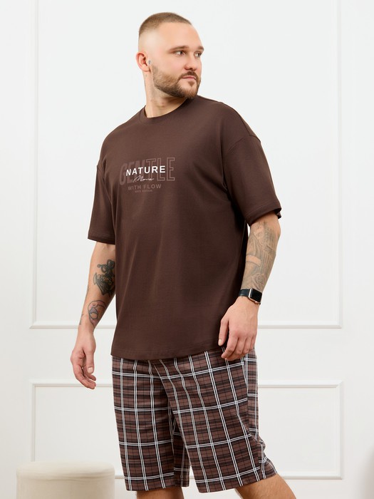 Костю мужской из трикотажного полотна "кулирка", состоящий из футболки и шорт. Футболка классического покроя, с короткими втачными рукавами и приспущенной линией плеч, горловиной овальной формы, обработанной втачной планкой и принтом на детали переда, выполненным в технике шелкографии. Нижние срезы рукавов и изделия обработаны подгибкой. По горловине настрочена отделочная строчка. Шорты длиной до колен, на притачном поясе с эластичной тесьмой внутри, с карманами в боковых швах. Нижние срезы обработаны подгибкой.