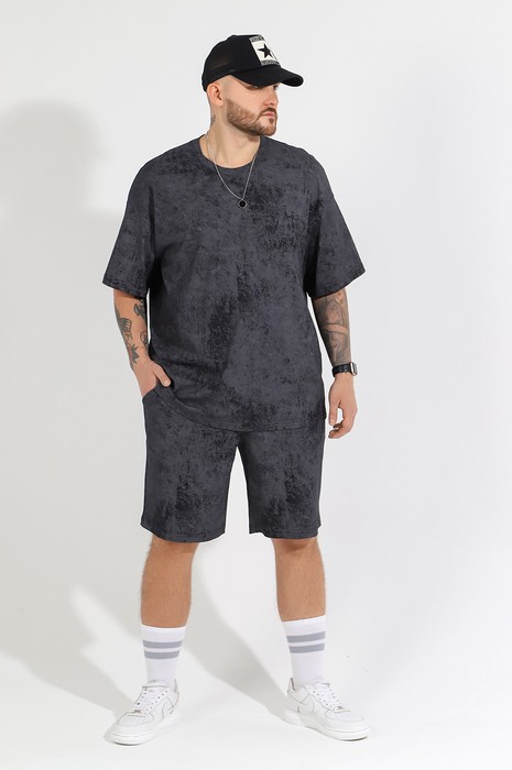 Костюм мужской, состоящий из футболки и шорт. Футболка - свободного покроя, короткими втачными рукавами и горловиной овальной формы, обработанной втачной планкой. По шву втачивания планки настрочена двойная отделочная строчка. Шорты - удлиненные, с карманами в боковых швах, на притачном поясе с эластичной тесьмой внутри.