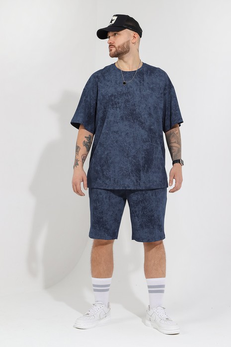 Костюм мужской, состоящий из футболки и шорт. Футболка - свободного покроя, короткими втачными рукавами и горловиной овальной формы, обработанной втачной планкой. По шву втачивания планки настрочена двойная отделочная строчка. Шорты - удлиненные, с карманами в боковых швах, на притачном поясе с эластичной тесьмой внутри.