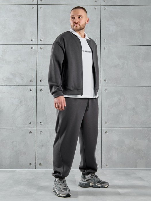 Костюм мужской из трикотажного полотна "лининг", состоящий из бомбера и брюк. Бомбер - с длиннми втачными рукавами с притачными манжетами, прорезными карманами с листочками на полочках, центральной бортовой застежкой на тесьму "молния", втачным воротником-стойкой с закругленными концами и притачным поясом по низу. По шву притачивания пояса и проймам настрочены отделочные строчки. Брюки - свободного покроя, со смещенными к центрам передних половин боковыми швами, карманами в боковых швах и притачным поясом с эластичной тесьмой внутри. Нижние срезы обработаны подгибкой с эластичной тесьмой. Для регулирования степени прилегания изделия по талии предусмотрен шнурок, вставленный через две обметанные петли в центре пояса спереди.