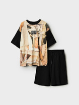 Костюм мужской, состоящий из футболки и брюк. Футболка однотонная с принтом на груди; модель свободная, со спущенной линией плеч, втачными рукавами, овальным вырезом горловины. Брюки из полотна с набивным рисунком эксклюзивного дизайна, прямые, с боковыми карманами с обтачными входами, на притачном поясе с отстроченной эластичной тесьмой.