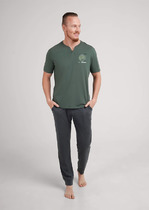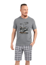 Костюм мужской, состоящий из футболки и шорт. Футболка однотонная с принтом на груди; модель свободная, со спущенной линией плеч. Шорты из полотна с набивным рисунком в узкую черно-белую полоску, с боковыми карманами с обтачными входами, на притачном поясе с отстроченной эластичной тесьмой.