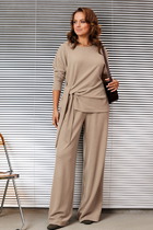 Костюм двухпредметный: состоит из джемпера и платья. Элегантный джемпер-кейп прямого свободного силуэта с спайетками. Горловина с цельнокроеным воротником-стойкой. Рукав втачной широкий, от линии локтя до запястья есть дополнительное отверстие для рук. Платье прямого силуэта, с небольшим расширением к низу, длиной макси. Перед с нагрудной вытачкой из бокового шва. Вырез горловины переда и спинки имеют V-образную форму.