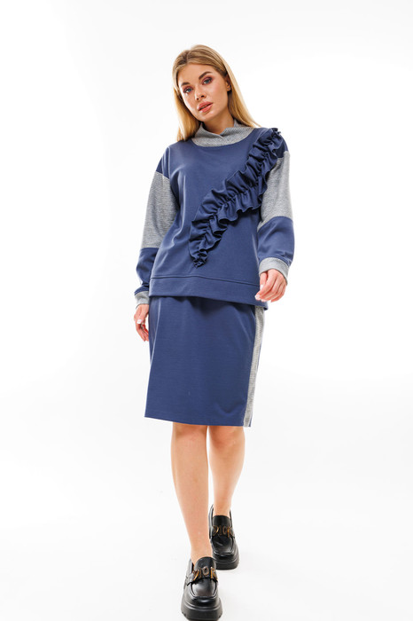 Трикотажный костюм двухпредметный: состоит из джемпера и юбки. Джемпер комбинированный свободного кроя со спущенной линией плеча. Горловина обработана воротником-стойкой с запахом. Рукава со вставкой из текстурного трикотажа "косичка". По низу рукава и изделия есть манжета. По переду изделие декорировано фигурными фалдами из основной ткани. Длина изделия 71 см. Длина рукава 58 см. Юбка-карандаш на резинке по линии талии. По боковым швам изделие декорировано трикотажной "косичкой".