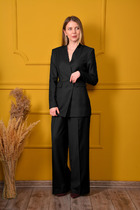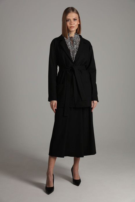 Костюм двухпредметный: состоит из жакета и юбки. Жакет свободного прямого силуэта длиной ниже линии бедер из костюмной ткани. Изделие со съемным поясом, на подкладке и накладными карманами. Рукав втачной, двухшовный, пройма спущена. Воротник английский. Застежка не предусмотрена. Элегантная юбка миди с запахом полуприлегающего силуэта. Правая часть переднего полотнища с двумя вертикальными односторонними складками и цельнокроеным подбортом. Запах юбки фиксируется поясом с пряжкой. Задняя часть с талиевыми вытачками. Верхний срез юбки обработан обтачками.