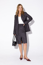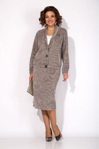 Костюм двухпредметный: состоит из жилета и юбки. Жилет полуприлегающего силуэта на подкладке. По переду вытачка, переходящая в подрез, функциональный карман. Застежка на петли-пуговицы. По спинке вытачки и хлястик. Элегантная юбка прямого силуэта длиной миди с разрезами на переднем и заднем полотнищах. Переднее полотнище с частичным запахом, имитацией боковых карманов с отрезным бочком. Заднее полотнище со средним швом, отрезной кокеткой, накладными карманами. Пояс притачной.
