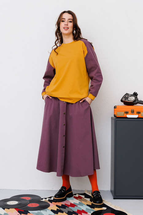 Костюм двухпредметный: состоит из джемпера и юбки. Джемпер из комбинированной ткани  свободного силуэта с округлой горловиной. Рукав с передними и задними швами. Верхняя и нижняя часть рукава образуют между собой разрез. Карманы в боковых швах.Роскошная юбка - солнце миди из облегчённого денима с узким поясом. В боковых швах расположены карманы. Застежка на кнопки с цельнокроеной планкой.  Длина  около 94 см. Изделие без подклада.