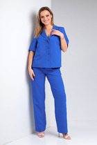 Костюм двухпредметный: состоит из рубашки - кропа и юбки. Укороченная рубашка из денима. Модель свободного кроя собрана на резинку по нижнему краю. Отложной воротник. Изделие застегивается на кнопки. Юбка - солнце длиной миди из облегчённого денима с узким поясом. В боковых швах расположены карманы. Застежка на кнопки с цельнокроеной планкой. Длина около 94 см. Изделие без подкладки.