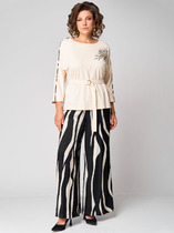 Костюм двухпредметный: состоит из жилета и брюк. Жилет из костюмной ткани полуприлегающего силуэта. Застежка центральная на петли и  пуговицы. Перед с талевыми вытачками, уходящими в линию низа. Спинка выполнена из отделочной ткани. В верхней части спинки расположена фигурная отлетная кокетка. На линии талии в боковых швах закреплен завязывающийся пояс. Брюки свободного кроя, верхний срез представлен широкой резинкой, с карманами