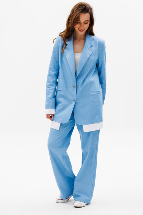 Костюм двухпредметный: состоит из жакета и брюк. Жакет прямого силуэта. На полочке нагрудная вытачка переведена в прорезной карман. Линия плеч расширена. Рукава втачные, длинные, двухшовные. Воротник отложной, пиджачного типа на отрезной стойке. Однобортная застежка на петли и пуговицы. Отделочные детали из хлопкового полотна по низу рукава и самого изделия создают имитацию рубашки, края не обработаны. Широкие брюки с двойным поясом из отделочной контрастной хлопковой ткани. Изделие по линии талии на резинке с имитацией гульфика. Карманы с отрезным бочком.