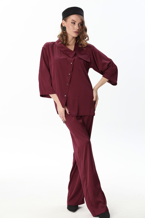 Костюм двухпредметный: состоит из жакета и брюк. Жакет рубашечного типа прямого силуэта с асимметричным низом. Рукав втачной со спущенной линией плеча, фиксируется на пату. Застежка центральная на петли и пуговицы, смещённая по косой. На левой полочке накладной карман с клапаном. Воротник отложной на стойке до половины спинки. Брюки свободного кроя из гладкой ткани сочетают элегантность и комфорт. Широкая резинка на поясе и наличие функциональных карманов подчеркивают удобство модели.