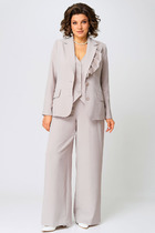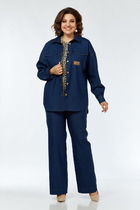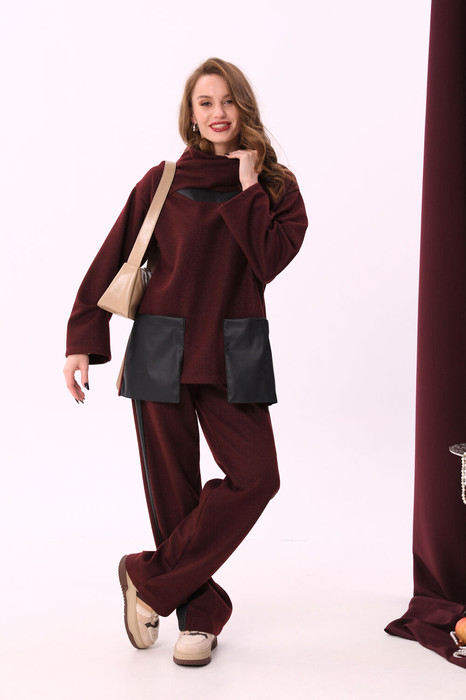 Костюм комбинированный двухпредметный: состоит из джемпера и брюк. Джемпер прямого свободного силуэта длиной до линии бедер, воротник хомут, рукав одношовный, втачной длиной до запястья. Спинка цельнокроеная. Перед состоит из двух частей- верхней и нижней. По нижней части переда сверху по центру вставка из отделочной ткани. По нижней части переда боковые накладные карманы из отделочной ткани, уходяшие в боковой шов, длинее линии низа переда вровень с линией низа спинки. Брюки прямого силуэта с наклонными карманами к боковым швам и лампасами из отделочной ткани. Пояс на резинке.