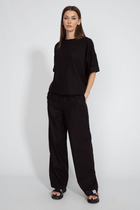Костюм двухпредметный: состоит из брюк и жакета. Жакет свободного прямого силуэта со слегка заниженной линией плеча. Однобортная застёжка на петли и пуговицы. По переду два больших накладных кармана, на левом кармане нашивка. Воротник шалевый цельнокроенный. Спинка с центральным швом. Изделие на подкладке. Брюки средней посадки на резинке, слегка зауженные к низу с наклонными боковыми карманами. Низ брючины ассиметричный по переду