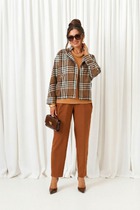 Костюм двухпредметный: состоит из джемпера и брюк. Джемпер-кейп прямого свободного силуэта. Горловина с цельнокроеным воротником-стойкой. Рукав втачной широкий, от линии локтя до запястья есть дополнительное отверстие для рук. Декорирован цветком из контрастной ткани. Брюки свободного кроя, верхний срез представлен широкой резинкой, с карманами.
