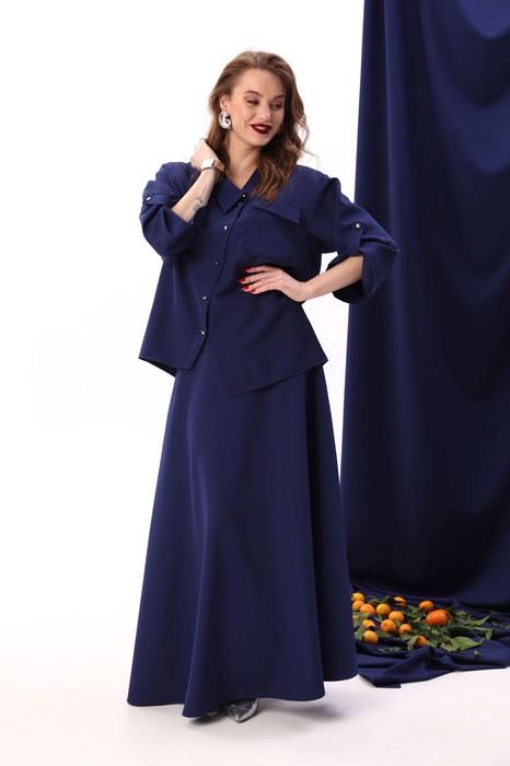 Костюм двухпредметный: состоит из жакета и юбки. Жакет рубашечного типа прямого силуэта с асимметричным низом. Рукав втачной со спущенной линией плеча, фиксируется на пату. Застежка центральная на петли и пуговицы, смещённая по косой. На левой полочке накладной карман с клапаном. Воротник отложной на стойке до половины спинки. Юбка - солнце макси с узким поясом. В боковых швах расположены карманы. Застёжка на петлю и пуговицу и молнию по спинке.