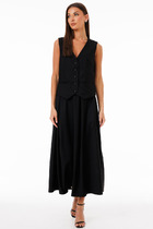 Костюм комбинированный двухпредметный: состоит из жакета и юбки. Жакет рубашечного типа прямого силуэта с асимметричным низом. Рукав втачной со спущенной линией плеча, фиксируется на пату. Застежка центральная на петли и пуговицы, смещённая по косой. На левой полочке накладной карман с клапаном. Воротник отложной на стойке до половины спинки. Юбка - солнце макси с узким поясом. В боковых швах расположены карманы. Застёжка на петлю и пуговицу и молнию по спинке.