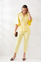 Костюм двухпредметный: состоит из жакета и брюк. Жакет прямого силуэта, воротник пиджачного типа, рукав одношовный, втачной с незначительно спущенной линией плеча, длинный, с притачной манжетой, декорированной разрезом. По линии ткани настрачная кулиса с завязками из основной ткани. Застежка центрально-бортовая. Линия низа верхней части фигурная ассиметричная. Брюки свободного кроя, верхний срез представлен широкой резинкой, с карманами.