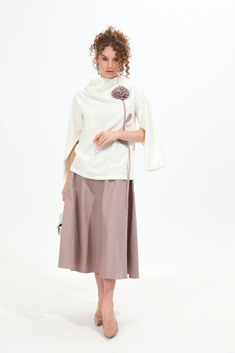 Костюм двухпредметный: состоит из джемпера и юбки. Джемпер-кейп прямого свободного силуэта. Горловина с цельнокроеным воротником-стойкой. Рукав втачной широкий, от линии локтя до запястья есть дополнительное отверстие для рук. Декорирован цветком из контрастной ткани. Юбка - солнце с узким поясом. В боковых швах расположены карманы. Застёжка на петлю и пуговицу и молнию по спинке.