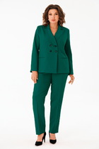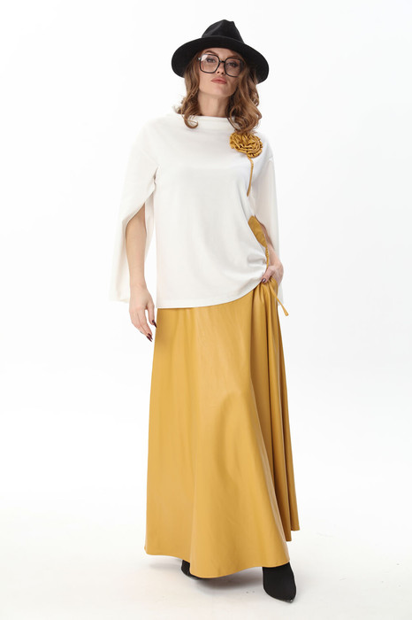Костюм двухпредметный: состоит из джемпера и юбки. Джемпер-кейп прямого свободного силуэта. Горловина с цельнокроеным воротником-стойкой. Рукав втачной широкий, от линии локтя до запястья есть дополнительное отверстие для рук. Декорирован цветком из контрастной ткани. Юбка - солнце с узким поясом. В боковых швах расположены карманы. Застёжка на петлю и пуговицу и молнию по спинке.