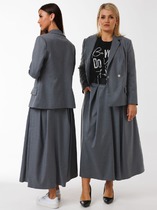 Костюм двухпредметный: состоит из жакета и юбки. Жакет прямого силуэта с имитацией центральной застёжки на пуговицы. Рукав втачной одношовный, длиной три четверти,застегивающийся на пату. Воротник пиджачного типа . Линия низа фигурная, симметричная . Юбка длиной миди, расклешенная к низу, с асимметричным низом. Пояс притачной, по спинке собран на резинку. Переднее полотнище состоит из трех частей. Правая часть скреплена отделочной строчкой и кнопками. В боковых швах изделия расположены карманы. По спинке изделия идёт средний шов и две вытачки для удачной посадки по фигуре. Юбка без подкладки.
