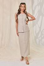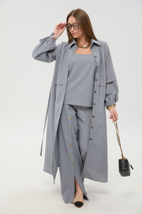 Костюм трехпредметный: состоит из кардигана-платья, брюк и топа. Платье-кардиган макси с центральной отрезной застёжкой на потайную планку на петли и пуговицы. По переду и спинке цельнокроеные складки на уровне талии. Рукав втачной, одношовный рубашечного типа. По низу рукава пробиты петли и вставлена завязка для фиксации сборки . Воротник рубашечный стояче отложной. В комплект к изделию идёт пояс из основной ткани для максимально комфортного регулирования объёма. Брюки свободного кроя, верхний срез представлен широкой резинкой, с карманами. По центру правой брючины расположена планка с функционирующими петлями и пуговицами. Топ на тонких регулируемых бретелях.