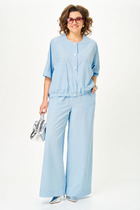 Костюм двухпредметный: состоит из жакета и брюк. Жакет прямого силуэта, воротник пиджачного типа, рукав одношовный, втачной с незначительно спущенной линией плеча, длиной три четверти, с патой. По линии ткани настрачная кулиса с завязками из основной ткани. Застежка центрально-бортовая. Линия низа верхней части фигурная ассиметричная. Брюки свободного кроя, верхний срез представлен широкой резинкой, с карманами. По центру правой брючины расположена планка с функционирующими петлями и пуговицами.