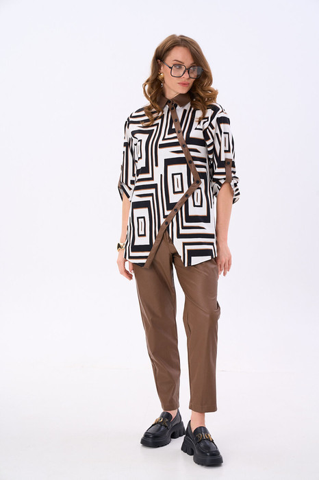 Костюм двухпредметный: состоит из жакета и брюк. Жакет рубашечного типа прямого силуэта с асимметричным низом. Рукав втачной со спущенной линией плеча, фиксируется на пату. Застежка фигурная на петли и пуговицы, смещённая по косой. Воротник рубашечный. Брюки с притачным поясом и с карманами в боковых швах.