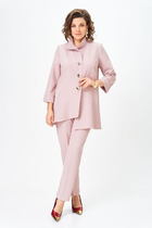 Костюм двухпредметный: состоит из жакета и брюк. Жакет рубашечного типа прямого силуэта с асимметричным низом. Рукав втачной со спущенной линией плеча, фиксируется на пату. Застежка фигурная на петли и пуговицы, смещённая по косой. Воротник рубашечный. Брюки с притачным поясом и с карманами в боковых швах.