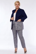 Особенностью этого костюма является контрастная двойная отделочная строчка на жакете. Эти элементы не только добавляет интереса к образу, но и создает визуальное подчеркивание, что помогает создать идеальный силуэт для женщин с большими размерами. Контрастные строчки выгодно подчеркивают форму жакета, делая его более стройным и элегантным.