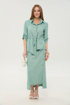 Комплект брючный 2-х предметный, состоящий из блузки и брюк. Блузка полуприлегающего силуэта, выполнена из вискозного полотна. Модель с плечевыми накладками и разрезами в боковых швах. Перед декорирован вставками с застроченными вертикальными защипами и отрезными фигурными планками, застегивающимися на 3 петли и 3 пуговицы. От планок к швам притачивания вставок направлены навесные петли, застегнутые на пуговицы. Спинка со средним швом; круглая горловина спинки обработана отрезной фигурной бейкой. Рукав короткий, втачной. Длина блузки – 66,5 (46-50 р-р) см, 69 см (52-60 р-р); длина рукава – 19,5 см (46-50 р-р), 20,0 (52-60 р-р) см. Брюки классические, с посадкой на талии, выполнены из вискозного полотна. Модель с центральной застёжкой на тесьму-«молнию», на притачном поясе, застегивающемся на петлю и пуговицу. Передние и задние половинки брюк с талиевыми вытачками, направленными от пояса вниз. Спереди обработаны боковые наклонные карманы. Для лучшего прилегания брюк в области талии в поясе по задним половинкам вставлена эластичная лента. Длина брюк по боковому (с поясом) – 101,5 см (46-50 р-р), 102,5 см (52-54 р-р), 103,5 см (56-60 р-р).
