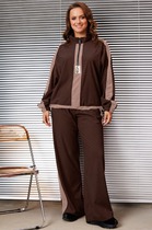 Комплект брючный 2-х предметный, состоящий из блузки и брюк. Блузка полуприлегающего силуэта, выполнена из вискозного полотна. Модель с плечевыми накладками и разрезами в боковых швах. Перед декорирован вставками с застроченными вертикальными защипами и отрезными фигурными планками, застегивающимися на 3 петли и 3 пуговицы. От планок к швам притачивания вставок направлены навесные петли, застегнутые на пуговицы. Спинка со средним швом; круглая горловина спинки обработана отрезной фигурной бейкой. Рукав короткий, втачной. Длина блузки – 66,5 (46-50 р-р) см, 69 см (52-60 р-р); длина рукава – 19,5 см (46-50 р-р), 20,0 (52-60 р-р) см. Брюки классические, с посадкой на талии, выполнены из вискозного полотна. Модель с центральной застёжкой на тесьму-«молнию», на притачном поясе, застегивающемся на петлю и пуговицу. Передние и задние половинки брюк с талиевыми вытачками, направленными от пояса вниз. Спереди обработаны боковые наклонные карманы. Для лучшего прилегания брюк в области талии в поясе по задним половинкам вставлена эластичная лента. Длина брюк по боковому (с поясом) – 101,5 см (46-50 р-р), 102,5 см (52-54 р-р), 103,5 см (56-60 р-р).