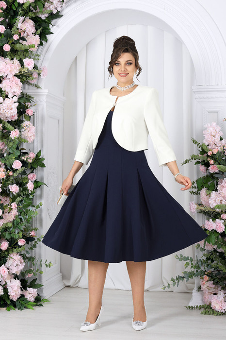 Комплект женский, состоящий из жакета и платья. Укороченный жакет полуприлегающего силуэта на подкладке. Деталь переда с двумя талевыми вытачками и с фигурным подрезом около горловины. Спинка со средним швом и рельефами, выходящими из проймы вниз. Рукава втачные, двухшовные, длиной 48,0 см., с разрезом по локтевому шву. Горловина углубленная, круглая, обтачная. Борта круглые, застежка на навесную петлю-пуговицу. Изделие с плечевыми накладками. Платье полуприлегающего силуэта, отрезное по линии талии. На детали переда рельефы выходят из проймы, проходят через центр груди вниз. Спинка цельнокроеная, с талевыми выточками. Юбка широкая к низу, с тремя клиньями спереди и сзади. Посередине каждого клина зашиты встречные складки. В левом боковом шве обработана застежка на потайную тесьму молнию. Рукава втачные, одношовные. Горловина углубленная, обтачная, с вырезом в виде “капельки” посредине переда. Углы выреза скреплены украшением. Пояс отлетной, обтачной, из двух цветов ткани, с перекантом на лицо и с застежкой на петлю-пуговицу сзади. Изделие с плечевыми накладками.
