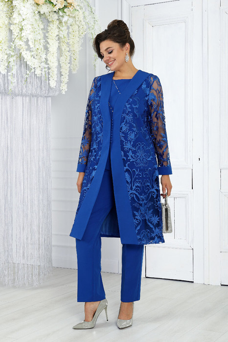 Комплект брючный 3-х предметный, состоящий из кардигана, блузки и брюк; выполнен из костюмно-плательной ткани и гипюра.