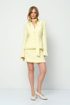 Туника полуприлегающего силуэта, выполнена из ткани «крэш-вискоза». Модель с плечевыми накладками, без застежки. Перед с нагрудными вытачками, спинка – с талиевыми. Боковые спинки и левый боковой переда равны по длине; правый боковой переда укорочен. Косой низ переда поддерживается патой, оба конца которой входят в боковой шов; вдоль длинного края паты частично застрочена односторонняя складка. Вырез горловины округлый, углубленный спереди. Рукав втачной, короткий, на притачной манжете, застегивающейся на 2 петли и 2 пуговицы; по середине рукава фигурный округлый вырез. Перед туники декорирован аппликацией, выполненной из страз. Длина туники – 101 см; длина рукава (с манжетой) – 47 см.