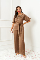 Брюки классические, длинные, с посадкой на талии, выполнены из ткани «лен-вишер». Модель со стрелками. Передние и задние половинки брюк с талиевыми вытачками, направленными от пояса вниз. Спереди обработаны наклонные боковые карманы и центральная застёжка на тесьму-«молнию». Притачной пояс застегивается на 1 петлю и 1 пуговицу; для лучшего прилегания по линии талии в притачном поясе предусмотрена эластичная лента, вставленная по спинке. Длина брюк по боковому (с поясом) -- 107 см (50-52 р-р), 108 см (54-58 р-р).