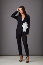Комплект брючный 3-х предметный, состоящий из жакета, джемпера и брюк. Жакет прямого силуэта, выполнен из ткани «лен-вишер». Модель без подкладки, с плечевыми накладками и однобортной внешней застежкой с отрезными планками на 7 петель и 7 пуговиц. Перед с нагрудными вытачками, выходящими из пройм. По спинке и частично по переду настрочена кулиса, в которую втянут поясок из основной ткани. Для регулировки сборки по кулисе предусмотрены фиксаторы, концы пояса оформлены наконечниками. Горловина округлой формы со стояче-отложным воротником на отрезной стойке. Рукав втачной, длинный, с притачной манжетой, застегивающейся на 1 петлю и 1 пуговицу; по середине рукава настрочена пата, застегивающаяся на 1 петлю и 1 пуговицу, что позволяет регулировать длину рукава. Длина жакета - 71 см (46-50 р-р), 72 см (52-60 р-р), 73 см (62-66 р-р). Длина рукава (с манжетой) - 61 см. Джемпер полуприлегающего силуэта, выполнен из вискозного трикотажного полотна. Перед с нагрудными вытачками, выходящими из пройм. От горловины вниз застрочены 4 складки. Горловина переда и спинки округлой формы, по переду углубленная. Срезы горловин окантованы косой бейкой. Рукав втачной, короткий. Длина джемпера -60 см (46-50 р-р), 65 см (52-60 р-р), 67 см (62-66 р-р). Длина рукава – 24,5 см (46-50 р-р), 25,5 см (52-60 р-р), 26,5 (62-66 р-р). Брюки классические длинные, прямого силуэта, с посадкой на талии, выполнены из ткани «лен-вишер». Модель без застёжки, на притачном поясе, с эластичной лентой внутри. Передние половинки брюк с боковыми наклонными карманами. Длина брюк по боковому (с поясом)-103 см (46-54 р-р), 104,5 см (56-60 р-р), 106 см (62-66 р-р).