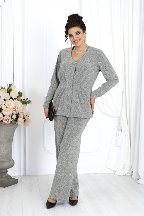 Элегантный брючный комплект – идеальный выбор для праздника, вечера в ресторане или важного мероприятия. Жакет с выразительным V-образным вырезом и аккуратными складками по линии талии подчёркивает женственный силуэт, а сияющая ткань с люрексом придаёт образу динамику и мягкость, создавая гармоничное сочетание классики и современности.