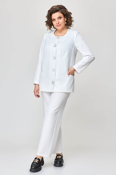Привлекательный нарядно-повседневный костюм порадует комфортом и поднимет настроение. Костюм в полоску с прямыми брюками скрывает пикантные особенности фигуры, а легкая, струящаяся ткань мягко подчеркивает женственность образа. Вертикальная полоска визуально стройнит и вытягивает силуэт. Жакет без воротника, на подкладке. На полочке обработаны функциональные, прорезные карманы с листочкой. Брюки прямого кроя. В боковом шве выполнен карман-хулиган. На передней и задней половинке – вытачки. Верхний срез обработан притачным поясом, а в области боковых швов собран на эластичную тесьму. Модель с гульфиком, застежка на пуговицу и тесьму-молнию. Посадка высокая. Длина жакета в размерах  c 54 по 60 - 72 см, в размерах с 62 по 64 - 80 см.
